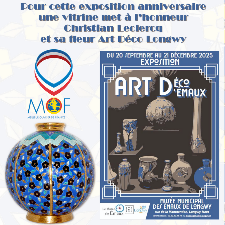 Journée du Patrimoine 2025 au Musée de Longwy Faïences & Emaux de LongwyPublié par Fabien Hubert Leclercq dans évènement · 3 Septembre 2025 Une belle exposition des anciens Longwy Art Déco et une vitrine dédiée à Christian Leclercq pour sa fleur de Longwy Art Déco.